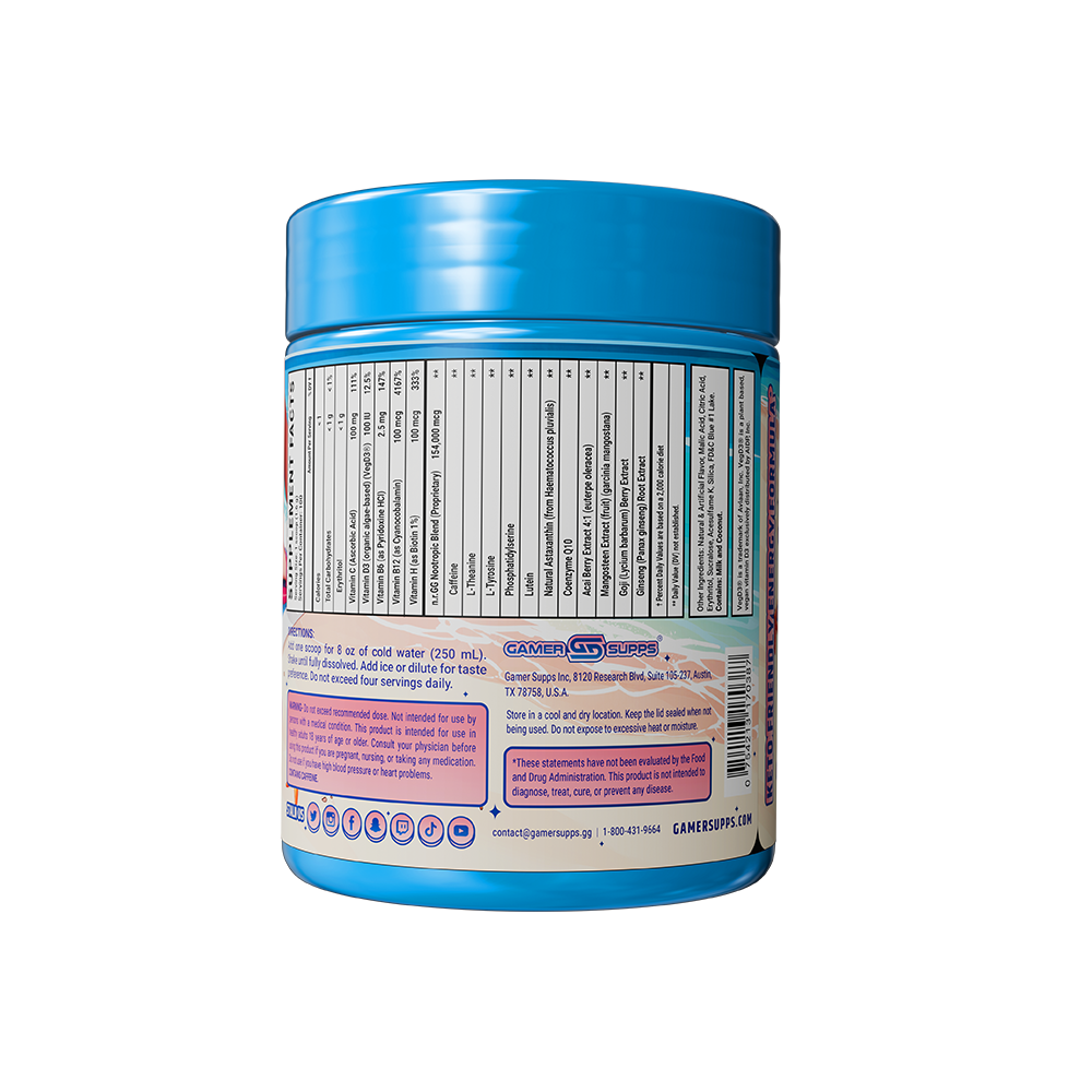 GG is the ultimate energy and focus formula designed to Level Up Your Gaming. The highest quality ingredients make up an energy formula that mixes completely and provides a healthier and more cost effective energy drink.